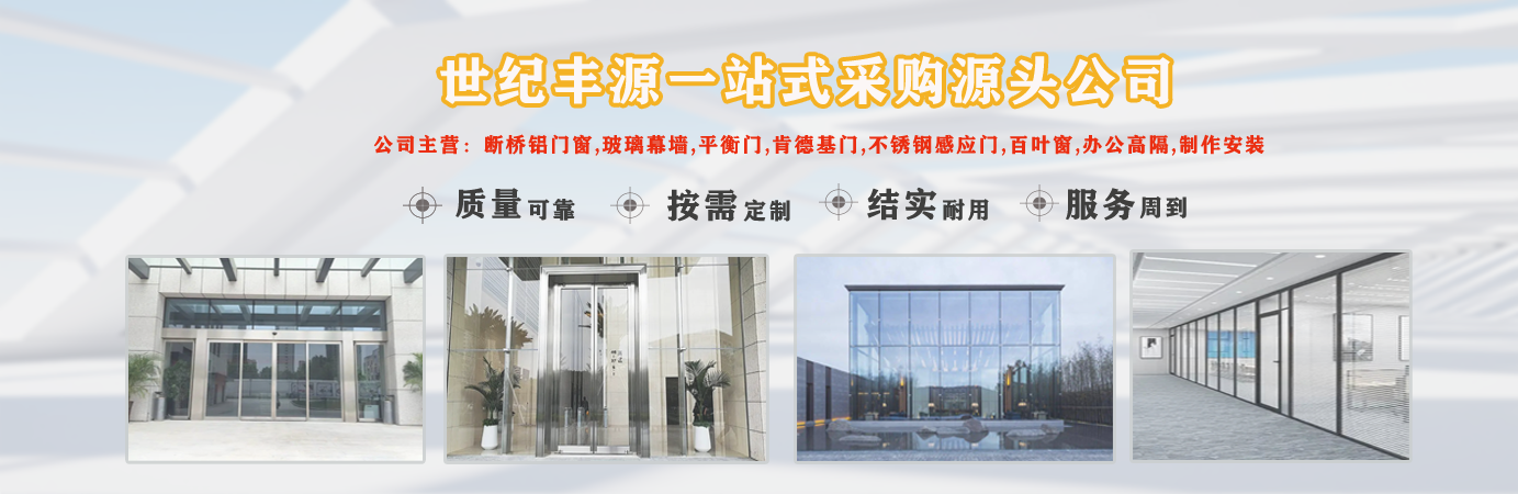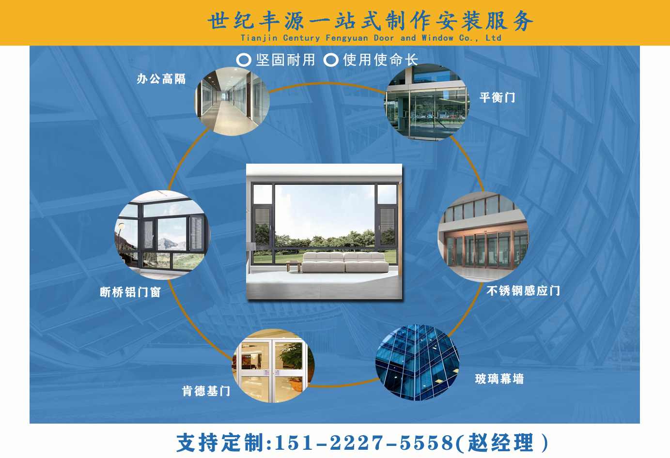 天津世紀(jì)豐源門(mén)窗有限公司從事斷橋鋁門(mén)窗,玻璃幕墻,平衡門(mén),肯德基門(mén),不銹鋼感應(yīng)門(mén),百葉窗,辦公高隔,制作安裝一站式訂制生產(chǎn)及配套服務(wù)等?! 」咀猿闪⒁詠?lái),始終堅(jiān)持以人才為本、誠(chéng)信立業(yè)的經(jīng)營(yíng)原則,薈萃業(yè)界精英,成熟的技術(shù)、管理方法及企業(yè)經(jīng)驗(yàn)與國(guó)內(nèi)企業(yè)的具體實(shí)際相結(jié)合,為企業(yè)供給各個(gè)方面的解決方案,使企業(yè)在激烈的市場(chǎng)競(jìng)爭(zhēng)中始終堅(jiān)持競(jìng)爭(zhēng)力,實(shí)現(xiàn)企業(yè)快速、穩(wěn)定地發(fā)展?! ≠|(zhì)量好、服務(wù)好、才能信譽(yù)好,公司已在諸多領(lǐng)域取得輝煌成績(jī),愿意成為您可信賴(lài)的長(zhǎng)期合作伙伴。 讓我們攜手同行,共同實(shí)現(xiàn)“讓普通老百姓都用得上高端門(mén)窗”...